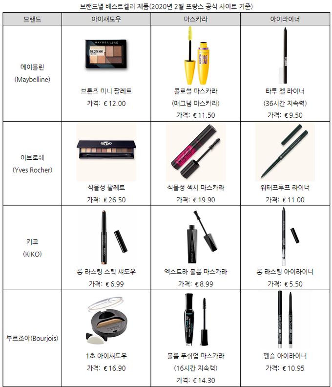 프랑스에서 인기 아이 메이크업 브랜드는 메이블린‧이브로쉐‧키코‧부르조아‧로레알 등이다.