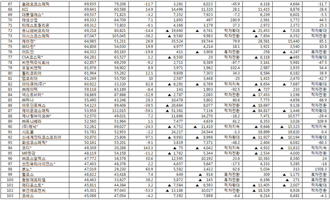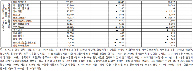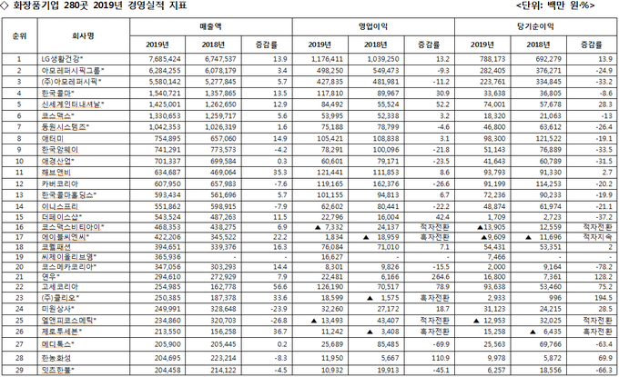 이 내용은 코스모닝이 지난 4월 19일 현재 금융감독원 전자공시시스템을 통해 2019년 사업보고서를 제출한 화장품 기업 280곳을 대상으로 진행한 지난해 화장품 기업 경영실적 분석자료에서 확인한 것이다.