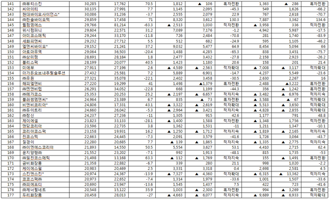 이를 분석 대상 전 기업으로 확대하면 지난해 당기순이익에서 적자(적자전환·적자지속·적자확대 모두 포함)의 성적표를 받아든 기업은 모두 96곳에 이르렀다. 34.3%나 되는 수치다.