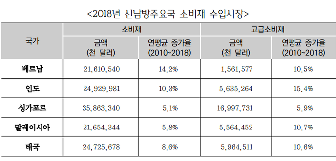 한국무역협회는 ‘신남방권 주요국 수입구조 분석’ 보고서를 발표했다. 베트남‧인도‧싱가포르‧말레이시아‧태국 5개국의 2010년부터 2018년까지 소비재 시장을 조사했다.