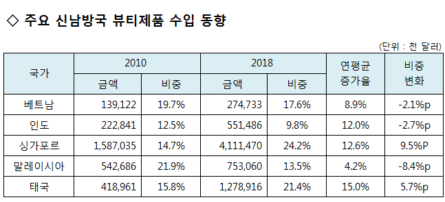 세계 인구의 4분의 1을 차지하는 신남방권. 신남방권 11개국의 평균 경제성장률은 2018년 5.2%로 세계 경제성장률 3%보다 2.2%p 높다. 베트남‧인도네시아‧인도의 경제성장률은 2010년부터 매년 5%를 웃돈다. 신남방권은 많은 인구와 높은 경제 성장을 바탕으로 수입시장 규모를 키우고 있다. 특히 한국산 뷰티제품을 중심으로 한 고급소비재 수입이 급증하는 추세다.