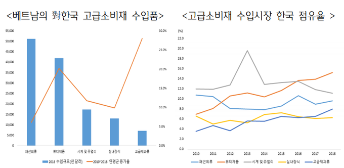베트남 한국산 뷰티제품을 중심으로 고급 소비재 시장 외형이 커졌다. 2018년 뷰티제품 수입액은 2억7천473억3천 달러다. 뷰티제품이 고급 소비재 수입에서 차지하는 비중은 2010년 19.7%에서 2018년 17.6%로 2.1%p 감소했다. 이 기간 뷰티제품의 연평균 수입 증가율은 8.9%다.