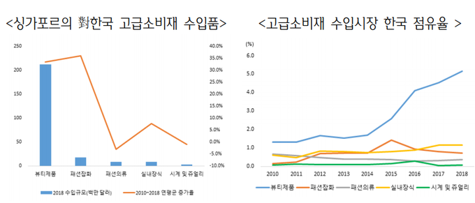 싱가포르의 2018년 뷰티제품 수입액은 41억1천147만 달러다. 전체 고급 소비재에서 차지하는 비중은 24.2%로 시계‧쥬얼리 다음으로 높다. 2010년부터 2018년까지 뷰티제품의 연평균 수입증가율은 12.6%로 다른 품목에 비해 가장 높은 수치를 나타냈다.