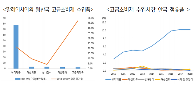 말레이시아 고급 소비재 수입 비중이 빠르게 증가하고 있다. 한국산 뷰티제품의 연평균 수입증가율도 상승세다. 2018년 뷰티제품 수입액은 7억5천306만 달러다. 여기서 한국 뷰티제품 수입 규모는 7천7백만 달러다. 뷰티제품 수입시장에서 한국제품 점유율은 2018년 10.3%로 2010년 대비 7.3% 상승했다.