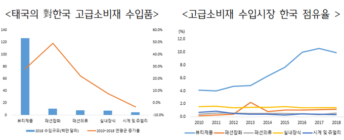 태국 2018년 태국의 뷰티제품 수입액은 12억7천891만6천 달러다. 2010년부터 2018년까지 연평균 수입 증가율은 15%에 달한다. 뷰티제품이 2018년 한국산 고급 소비재 수입액 가운데 차지한 비중은 9.9%로 가장 높은 수치다.