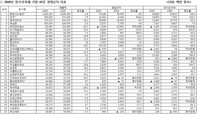 <2019년 용기·부자재기업 43곳 경영실적 지표 파일: 아래 첨부문서/