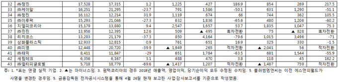 영업이익에서 적자(전환·지속·확대)에 머문 곳은 5곳이었고 흑자전환에 성공한 기업 역시 5곳이었다. 영업이익이 증가한 곳은 20곳, 감소한 곳은 13곳으로 나타났다.