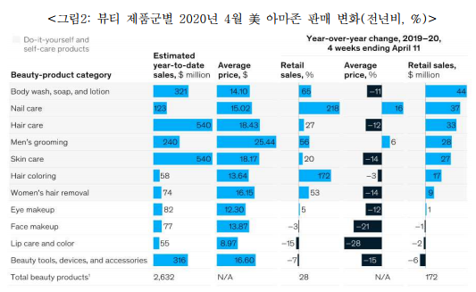 4월 아마존서 네일케어‧헤어염색‧목욕제품 매출은 전년 동기 대비 218%, 172%, 65% 늘었다. 미용실을 찾는 대신 집에서 염색과 네일아트를 즐기는 소비자도 많아졌다. DIY 염색키트와 네일케어 매출도 세계적으로 상승하는 추세다.