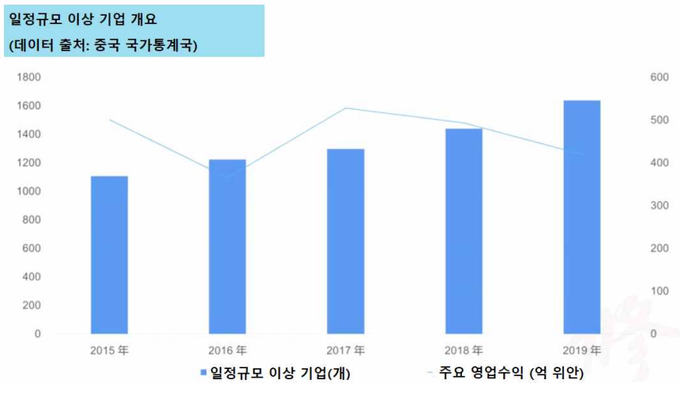 현재 중국의 일정규모 이상 생산기업은 2015년에 368곳, 주요사업 수익 1천500억 위안을 기록한 것을 위시해 △ 2017년 432곳, 주요사업 수익 1천582억 위안 △ 2019년 545곳, 주요사업 수익 1천256억 위안이었다. 기업수는 점차 증가하고 있지만 2017년을 기점으로 주요사업 수익은 감소세를 보이고 있다는 사실을 알 수 있다.