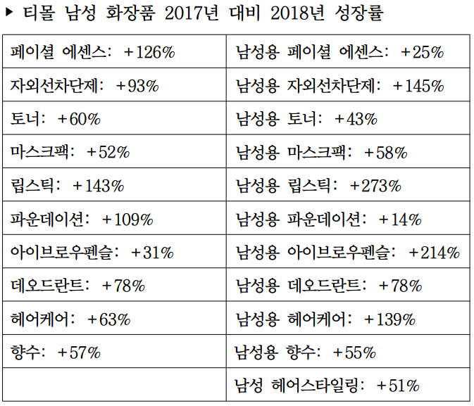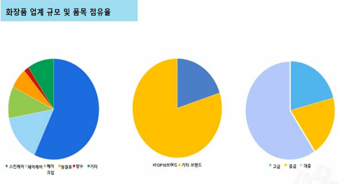이를 점유율로 환산하면 △ 스킨케어 57% △ 헤어케어 15% △ 메이크업 10% △ 청결7% △ 향수 1.5% △ 기타 9.4% 등이다.