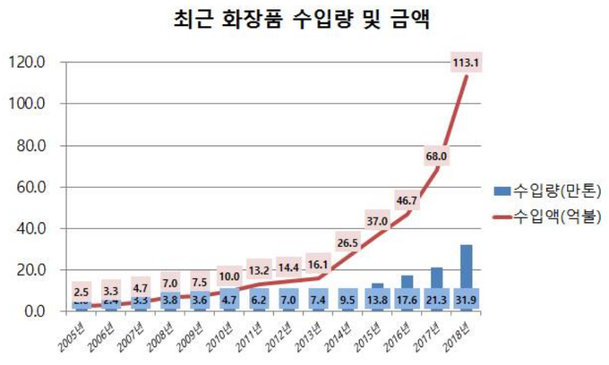 중국 상무부 발표에 따르면 국경간 전자상거래를 통한 2018년 소매 수출입금액은 1천347억 위안으로 전년도 대비 49.3%가 증가했다. 그 중 수출은 561억 위안으로 67% 증가했고 수입금액은 786억 위안으로 40% 증가했다. 이 가운데 화장품 수입이 가장 많아 전체 수입금액의 35.9%를 차지하는 결과를 나타냈다.