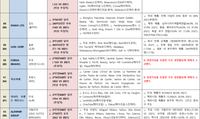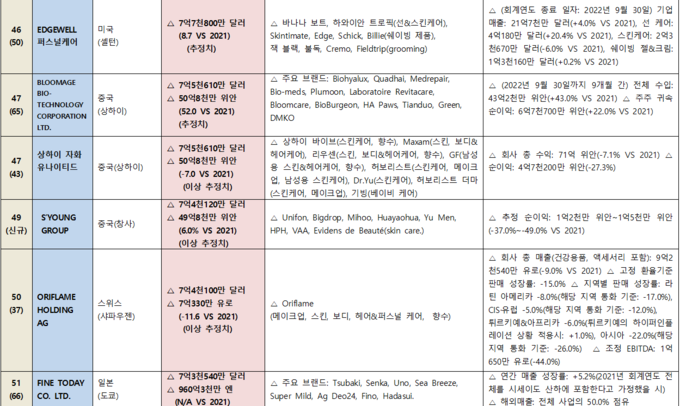 <WWD 2022’s Top 100 Global Beauty Manufacturers 각 기업별 전체 내용은 아래 첨부문서 또는 코스모닝닷컴 자료실 → 통계&마케팅 자료실에서 볼 수 있다.>