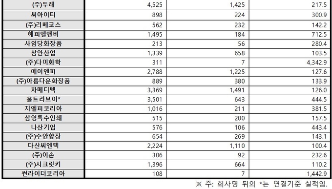 OEM·ODM 기업은 엔코스(778.4%)·인터코스코리아(203.5%)·한국화장품제조(194.1%)·코스모코스(108.4%)·비앤비코리아(138.7%)·지디케이화장품(522.7%)·정코스(357.9%) 등이 분전했다.