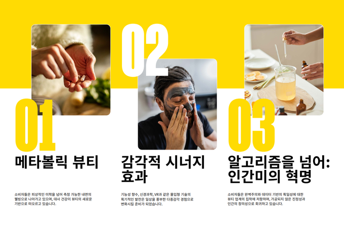 소비자는 장 건강, 호르몬, 스트레스, 수면 등 내부 건강에 초점을 맞춘다. 세포 에너지와 피부 건강을 증진하는 성분을 선호한다. 뷰티제품이 내면의 건강을 진단하는 도구가 되길 기대한다. 화장품은 △ 증거 중심적 △ 개인 맞춤형 △ 예방적 성격으로 재구성될 움직임이다.