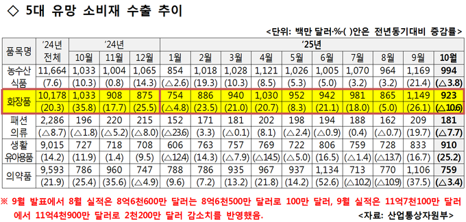 산업통상자원부(장관 김정관· www.motie.go.kr )이 잠정 집계, 발표한 ‘10월 수출입동향’자료에 따르면 이 기간 우리나라 화장품 수출 실적은 9억2천300만 달러를 기록, 전년 같은 기간의 10억3천300만 달러보다 1억1천만 달러·10.6%가 감소했다.