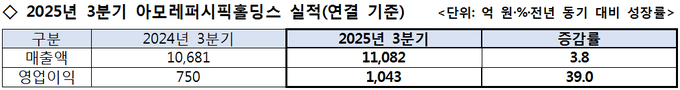 아모레퍼시픽홀딩스의 지난 3분기 매출은 1조1천82억 원, 영업이익은 1천43억 원으로 나타났다. 매출은 전년 동기 대비 3.8%, 영업이익은 39.0% 증가한 수치다.