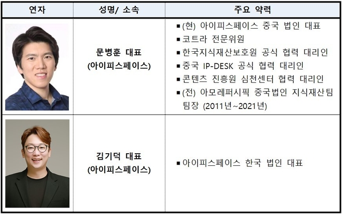 특히 문병훈 대표(아이피스페이스 중국법인 대표)는 코트라 전문위원이자 한국지식재산보호원 공식 협력 대리인으로 활동 중이다. (주)아모레퍼시픽 중국법인 지식재산팀장을 역임한 바 있어 실무와 이론을 고루 갖춘 전문가로 평가받고 있다. 김기덕 아이피스페이스 한국법인 대표는 한·중 지식재산권 보호와 단속 대응 분야의 실무 경험이 풍부한 전문가다.