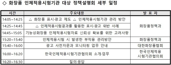 정책 설명회에서는 △ 화장품 표시·광고 제도와 표시·광고 위반 사례 △ 인체적용시험기관 관리 방안 △ 기능성화장품 인체적용시험자료 신뢰성 확보를 위한 고려사항 △ 광고 사전자문과 모니터링 업무 안내 △ 한국인체적용시험기관협의회 소개와 업무 등을 주요 콘텐츠로 구성할 예정이다.