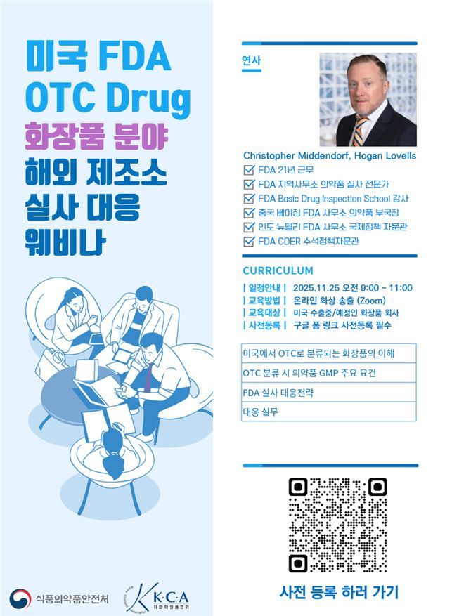 식품의약품안전처(처장 오유경· www.mfds.go.kr )는 “국내 화장품 기업들의 미국 수출을 보다 실무 차원에서 지원하기 위해 대한화장품협회(회장 서경배· www.kcia.or.kr )와 함께 ‘미국 FDA OTC 드럭 화장품 분야 해외 제조소 실사 대응 교육-웨비나’을 오는 25일(화) 개최한다”고 밝혔다.