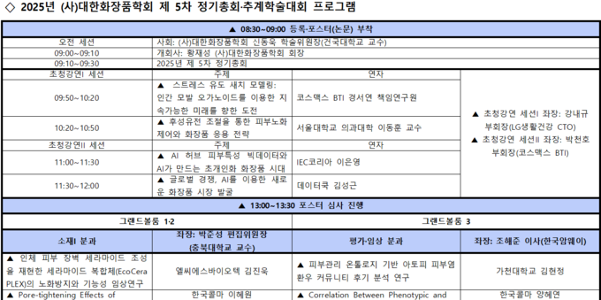 ‘대한화장품학회 추계학술대회’는 초청강연으로 시작했다. 강연 주제는 △ 스트레스 유도 새치 모델링 : 인간 모발 오가노이드를 이용한 지속가능한 미래를 향한 도전(정서연‧코스맥스BTI) △ 후성유전 조절을 통한 피부노화 제어와 화장품 응용 전략(이동훈‧서울대 의과대학) △ AI Hub 피부특성 빅데이터와 AI가 만드는 초개인화 화장품 시대(이은영‧IEC코리아) △ 글로벌 경쟁, AI를 이용한 새로운 화장품 시장(김성근‧데이터쿡) 등이다.