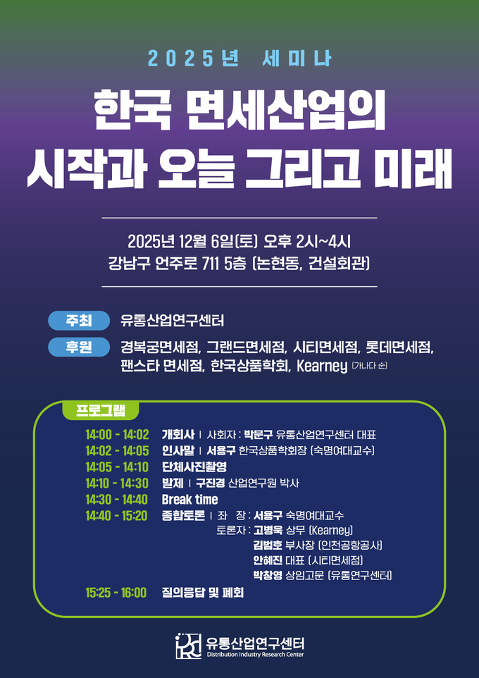 유통산업연구센터(대표 박문구)가 12월 6일(토) 오후 2시부터 서울 논현동 건설회관 5층에서 ‘2025년 면세산업 세미나’를 개최한다.