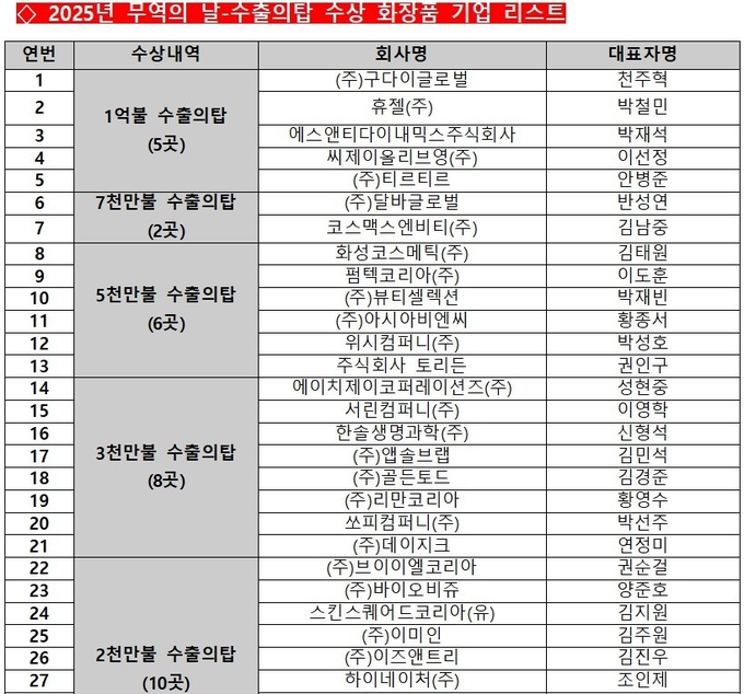 <2025년 제 62회 무역의날 정부 훈·포장·표창장 수상자 명단&수출의탑 수상기업 리스트: 아래 첨부문서 또는 코스모닝닷컴 자료실 통계&마케팅 데이터 https://www.cosmorning.com/mybbs/bbs.html?mode=view&bbs_code=data&cate=&page=&search=&keyword=&type=&bbs_no=217601 참조>