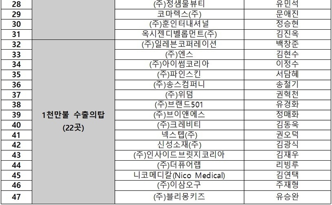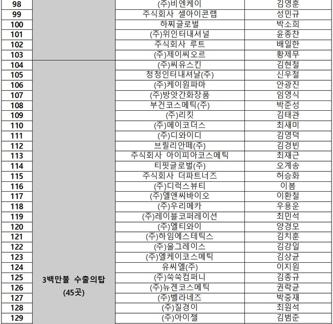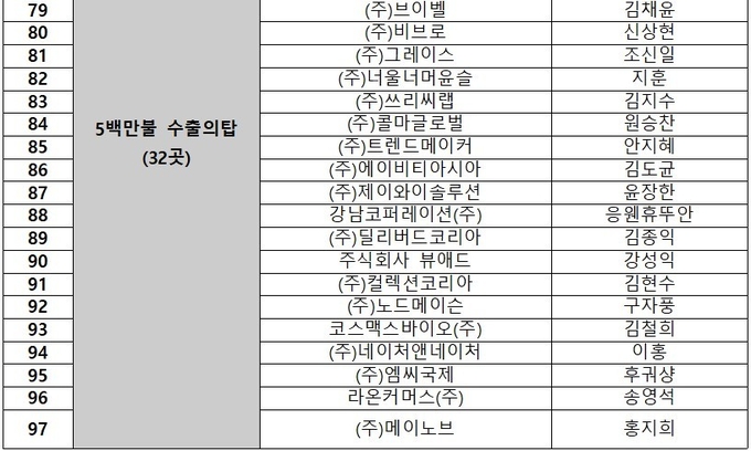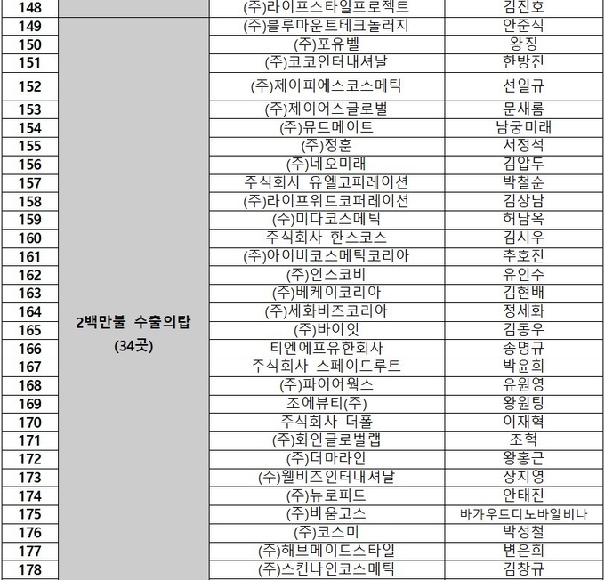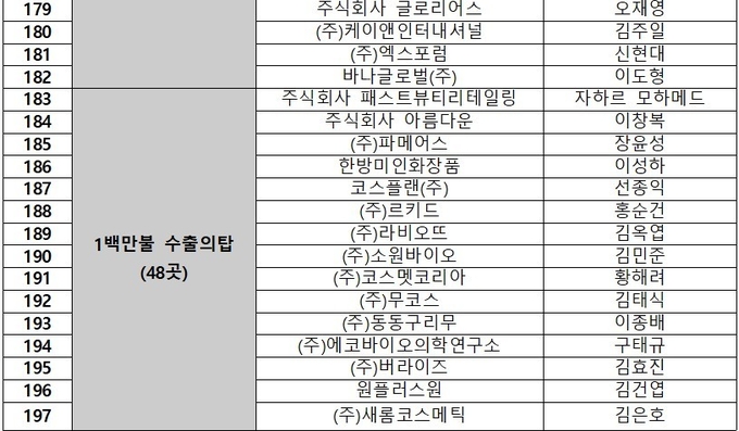 비록 지난해 4곳이었던 2억불 수출의탑 수상기업은 없었지만 1억불 수출의탑 수상기업이 모두 5곳((주)구다이글로벌·휴젤(주)·에스앤티다이내믹스주식회사·씨제이올리브영·(주)티르티르)으로 지난해보다 4곳이 더 늘어났다.