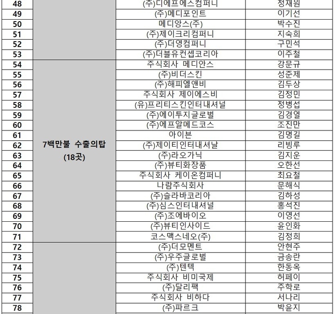 △ 7천만불 수출의탑 2곳(-1·이하 ( )안의 숫자는 지난해 대비 증감수) △ 5천만불 수출의탑 6곳(0) △ 3천만불 수출의탑 8곳(+3) △ 2천만불 수출의탑 10곳(0) △ 1천만불 수출의탑 22곳(0) △ 7백만불 수출의탑 18곳(-2) △ 5백만불 수출의탑 32곳(+7) △ 3백만불 수출의탑 45곳(+18) △ 2백만불 수출의탑 34곳(-1) △ 1백만불 수출의탑 48곳(+12) 등으로 집계됐다.