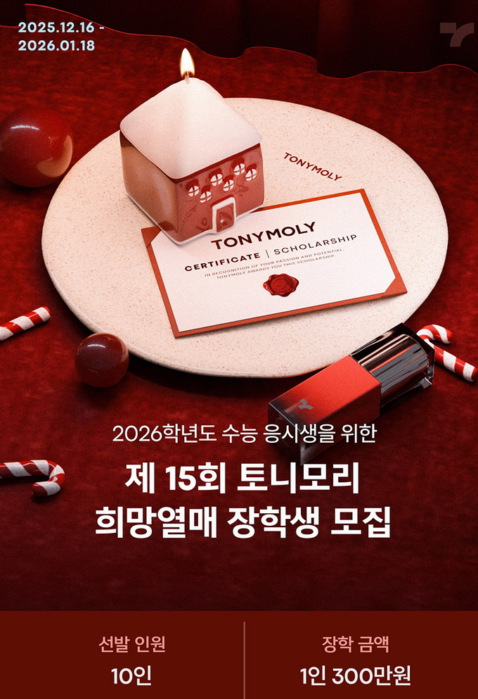 토니모리가 2026년 1월 18일까지 예비 대학생을 대상으로 장학생 10명을 모집한다.