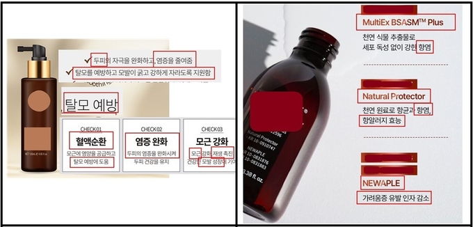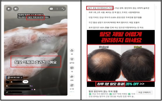 이들 광고는 탈모약·탈모방지·탈모예방·염증완화·항염·발모제·모발성장촉진·발톱무좀치료 등으로 광고해 소비자가 의약품으로 오인할 가능성을 내포하고 있었다.