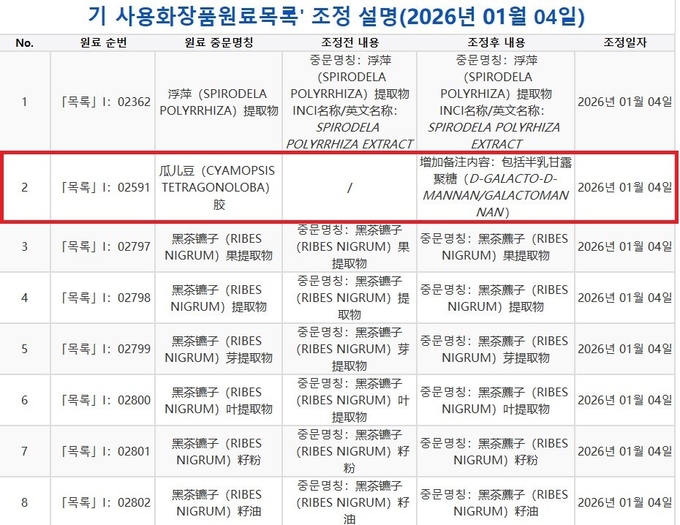 <‘기 사용화장품 원료목록 조정 설명’(2026년 1월 4일자)에 대한 내용은 아래 첨부문서 또는 https://www.nmpa.gov.cn/hzhp/hzhpjgdt/20260104142237112.html 참조>