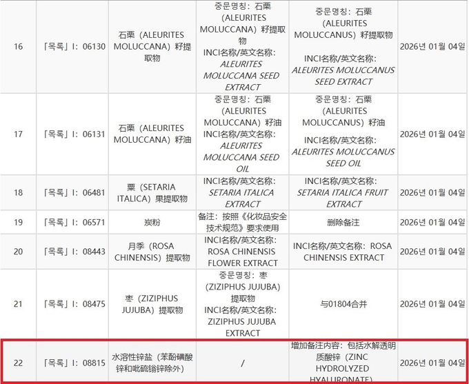 둘째, 관련 원료의 중문명칭 또는 INCI 명칭·영문 명칭을 표준화하고 비고 사항 등을 수정했다.