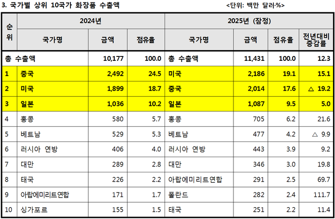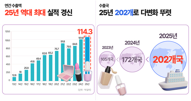 식품의약품안전처(처장 오유경· www.mfds.go.kr )는 “2025년 한 해 동안(12월말 기준·잠정 집계) 우리나라 화장품 수출 규모가 직전 년도(2024년) 보다 12.3% 증가한 114억 달러를 기록하며 역대 최대 실적을 경신했다”고 밝혔다.
