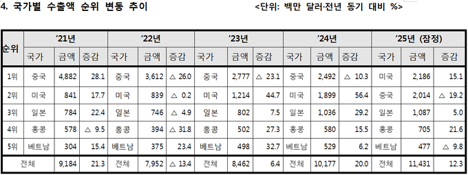 미국으로의 수출액은 지난 2021년 2위를 기록한 후 지속 증가세를 보이며 2023년에 10억 달러를 넘겼고 지난해 난공불락으로 여겨졌던 중국을 앞서는 저력을 보였다.