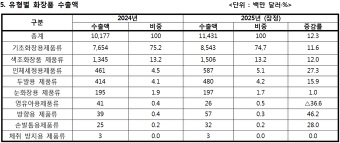 유형별 수출액은 △ 기초화장품 85억4천만 달러(8억9천만 달러·11.6%) △ 색조화장품 15억1천만 달러(1억6천만 달러·12.0%) △ 인체세정용 제품 5억9천만 달러(1억3천만 달러·27.3%) 순이었다.