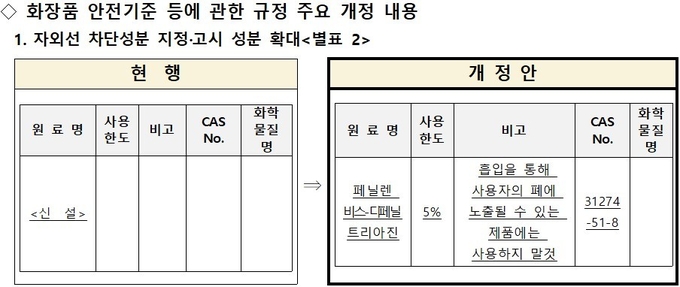 개정(안)에 따르면 화장품 업체가 신청한 ‘페닐렌 비스-디페닐트리아진’에 대한 심사 결과 안전성·유효성 등 사용 타당성을 인정해 해당 원료의 목록과 사용기준 등을 홈페이지에 공고한 바 있으며 이를 고시에 반영한다는 계획이다. 이로써 ‘자외선 차단’ 목적으로 사용 가능한 성분은 32개까지 확대됐다.