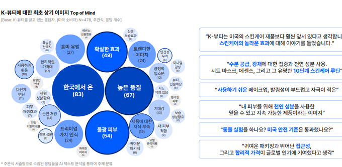 이어 “K-뷰티가 미국시장에 안착하려면 ‘우수한 품질’과 ‘확실한 효과’를 갖춰야 한다. 트렌디한 이미지와 합리적인 가격대도 선호요인이다. K-뷰티의 성분 안전성에 대한 기대와 우려가 공존하는 만큼 소비자 신뢰를 구축하기 위한 커뮤니케이션이 필요하다”고 말했다.