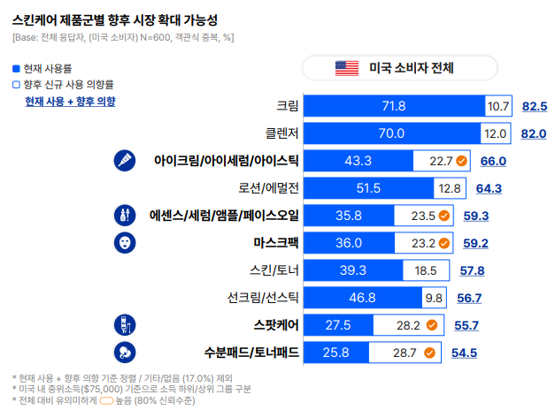 미국 스킨케어 시장에서 성장 가능성이 높은 품목은 수분패드와 스팟케어 등으로 꼽혔다. 미국 소비자는 두 품목을 사용할 의향이 가장 많다고 응답했다. 20대층은 에센스‧선케어‧스팟케어 등 기능성 제품에 대한 잠재적 수용도가 상대적으로 높았다.