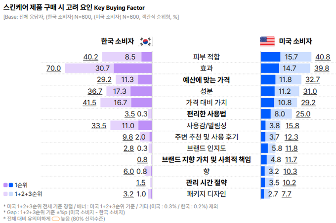 아울러 미국 소비자는 스킨케어 구매 시 △ 효능 △ 사용 편의성 △ 브랜드의 사회적 가치를 살폈다. 제품의 피부 적합성과 효과를 우선시하는 가운데 가격‧실용성‧사용법을 동시에 고려했다.