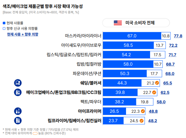 미국 메이크업 시장에선 프라이머와 베이스 제품이 성장세를 이어갈 전망이다. 미국 소비자는 립프라이머‧아이프라이머‧톤업크림 등을 써볼 의향이 있다고 답했다. 히스패닉 그룹이 아이프라이머에 대해 가장 강력한 니즈를 보였다. 흑인 그룹은 팩트‧파우더에 대한 잠재 수요가 높았다.