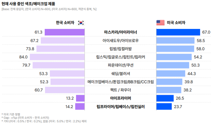 미국 소비자는 눈매를 강조하고, 메이크업의 지속력을 높이는 제품을 선호했다. 한국 소비자가 파운데이션‧쿠션을 활용해 결점 없는 피부를 연출하는 데 초점을 맞췄다.