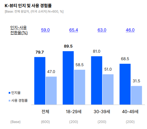 미국에서 K-뷰티를 알린 소비층은 20대, 실제 구매한 소비층은 30대다. 전체 응답자의 80%가 K-뷰티를 인지하고 있다고 답했다. 특히 18~29세는 10명 중 9명이 K-뷰티를 알고 있다고 말했다. 2030층의 절반이 K-뷰티를 사용한 적이 있으며, 30대 그룹은 앞으로 K-뷰티를 구매할 의향이 가장 높았다.