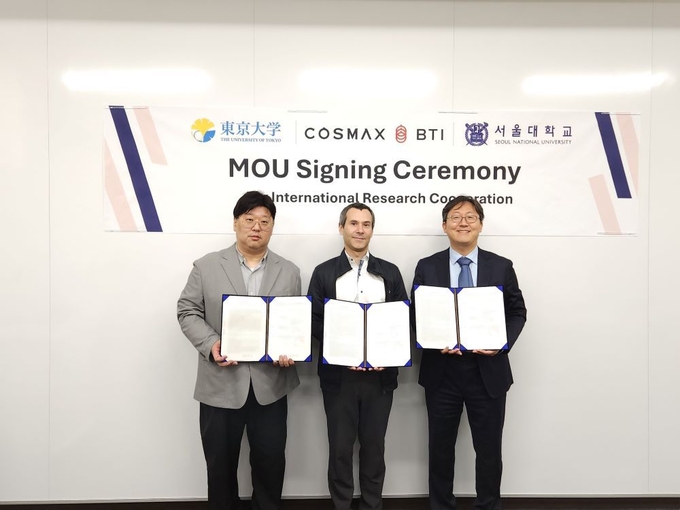 코스맥스는 “일본 도쿄에서 서울대학교·일본 도쿄대학교와 글로벌 공동 연구를 위한 3자 연구 협약을 체결했다”고 밝혔다. 협약식에는 △ 코스맥스비티아이 윤석균 BI(Bio Innovation) 랩장 △ 서울대학교 자연과학대학 화학부 이연 교수 △ 도쿄대학교 오라시오 카브랄(Horacio Cabral) 바이오 엔지니어링학과 교수가 참석했다.