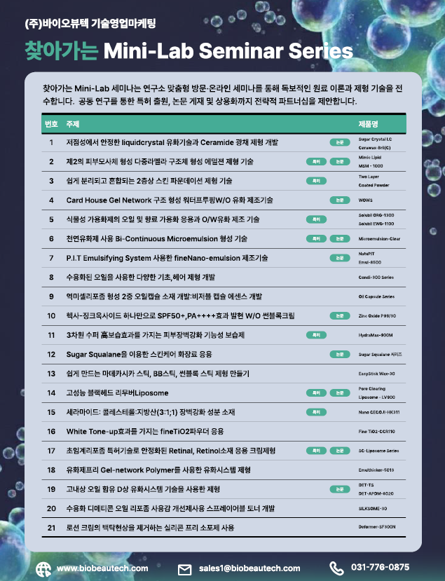(주)바이오뷰텍 (대표이사 김인영)은 화장품 ODM·OEM 고객사 연구원들의 편의를 위한 ‘찾아가는 미니랩(MiniLab) 기술 세미나’를 기획, 본격 가동에 들어간다.