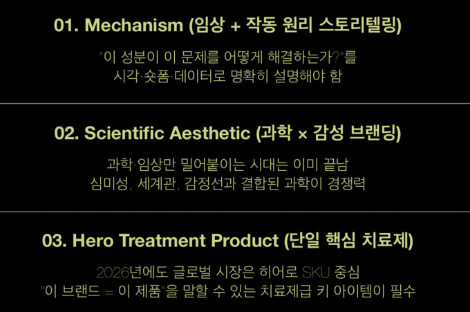2026년 뷰티시장에서 브랜드의 생존력을 가를 핵심 문법이다. 전문의·약사·에스테티션 등 KOL이(누가), 히어로 제품을(무엇을), 임상 자료에 기반해(근거) 설명하는 구조가 중요해진다. 관건은 진정성이다. 이는 인플루언서·바이럴·알고리즘 피로도를 밀어내는 힘이다.
