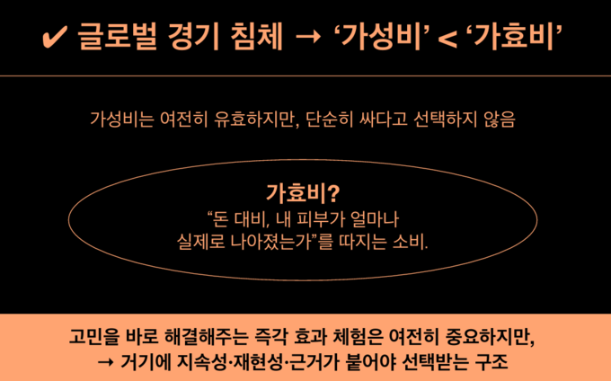 가성비 대신 ‘가효비’가 소비 기준이 된다. 소비자는 가격보다 효능을 묻는다. “지출한 돈만큼 피부가 나아졌는가” “어떤 메커니즘으로 어디에 효과가 있는가”에 대한 답을 제품에서 찾는다. 이는 과잉 바이럴과 상충된 리뷰에 대한 반작용이다.