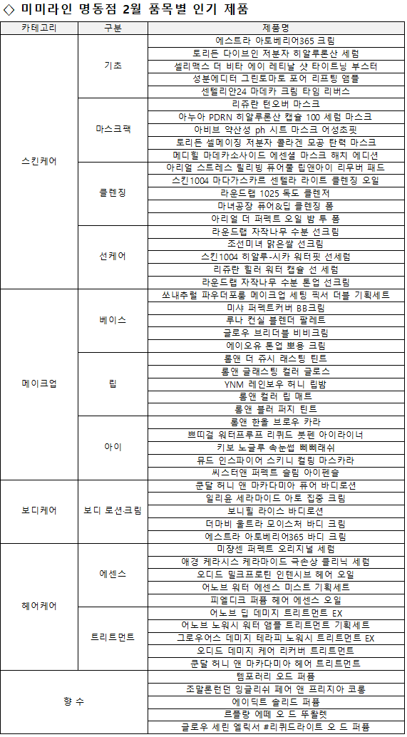 미미라인 명동점에서 2월 매출 1위부터 10위는 △ 리쥬란 턴오버 마스크 △ 바이오던스 바이오-콜라겐 리얼 딥 마스크 △ 어노브 딥 데미지 트리트먼트 EX △ 이니스프리 노세범 미네랄 파우더 △ 리쥬란 스킨 프로텍션 마스크 △ 셀리맥스 더 비타 에이 레티날 샷 타이트닝 부스터 △ 라네즈 립 슬리핑 마스크 베리 △ 리쥬란 힐러 턴오버 앰플 듀얼 이펙트 △ 리쥬올 어드밴스드 피디알엔 릴리프 크림 등이다.