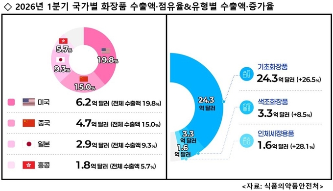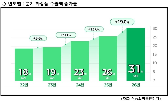 식품의약품안전처(처장 오유경· www.mfds.go.kr )는 이같은 내용을 기반으로 2026년 1분기 화장품 수출 실적 통계를 발표하고 “올해 2월 수출액은 전년 동기 대비 큰 성장세를 기록하지 않았으나(3.5% 증가-산업통상부 집계 기준) 1월과 3월에는 각각 36.1%, 27.0%가 증가(산업통상부 집계 기준)함으로써 분기별 역대 최대 실적에 기여했다”고 밝혔다.