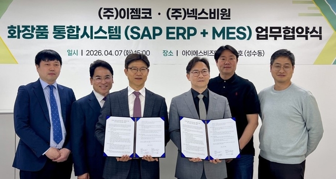 화장품·제약·식품 분야 디지털 트랜스포메이션(DX)을 선도하고 있는 (주)이젬코(대표이사 이종극)와 SAP ERP 구축·소프트웨어·솔루션 개발 전문 기업 (주)넥스비원(대표이사 김태룡)이 화장품 통합 시스템(SAP ERP+MES) 구축을 위한 업무협약(MOU)을 체결, 두 회사의 기술력과 사업 역량이 시너지를 창출할 수 있는 기반을 마련했다.