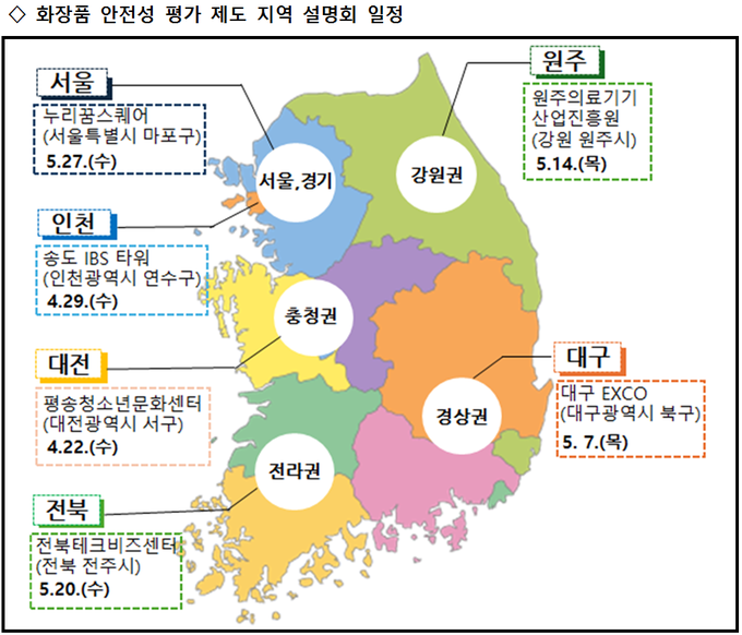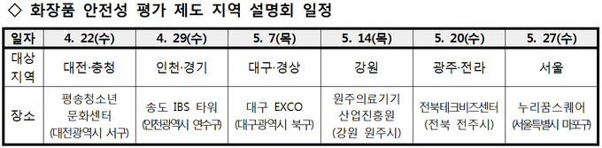 지역별 설명회에서는 △ 화장품 안전성 평가 제도 도입 개요와 추진사항 △ 화장품 안전성 평가 정부 지원사업 △ 글로벌 진출 지원을 위한 해외 화장품 안전성 평가 제도 소개 △ 화장품 표시·광고 사례 등을 안내한다.